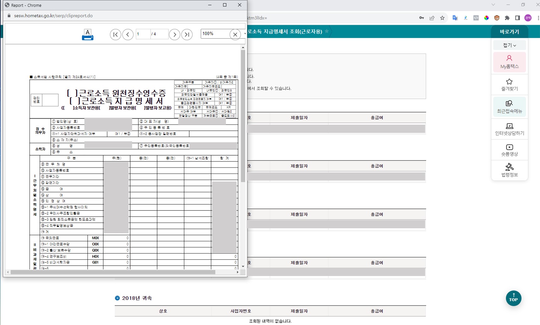 국세청 홈택스가 로그인 되어 있지 않았다면 국세청 홈택스 로그인 후 아래의 이미지처럼 근로했던 년도와