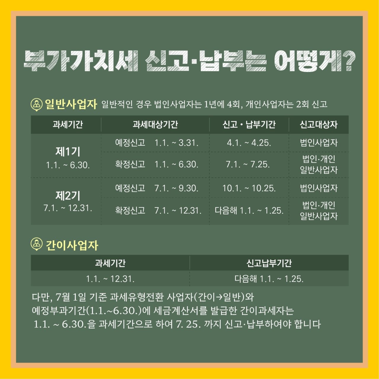 예정신고 7.1. ~ 12.31. | 다음해 1.1. ~ 1.25. | 법인 ·개인 일반사업자 |