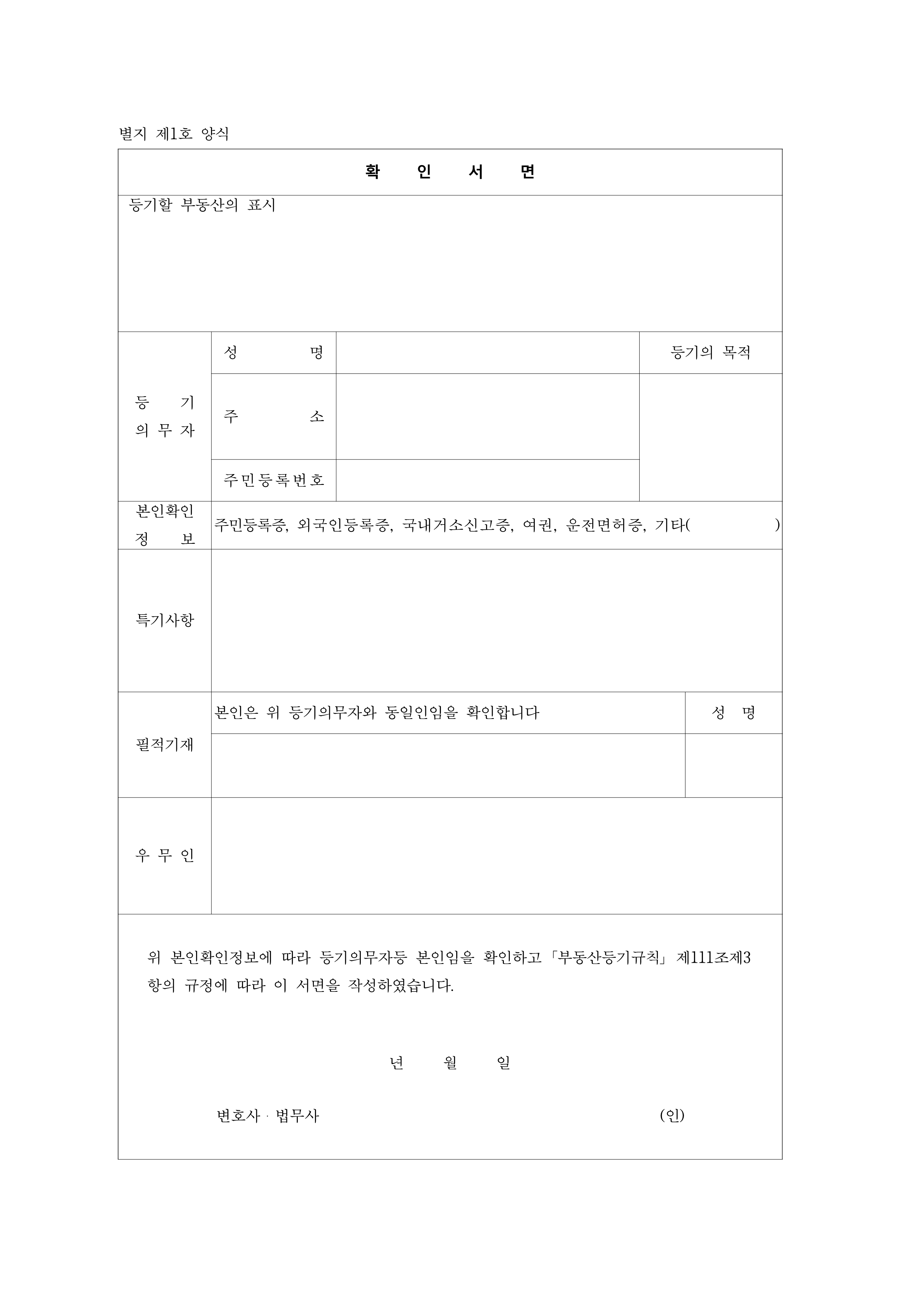 확인서면(개인)은 부동산 등기필증(집문서) 분실 시 매도인(등기의무자) 본인 확인을 위해 법무사나 변호사가 작성하는 서류입니다. 등기 신청 시 자격자대리인이 면담 후 별지 제1호 양식에 성명, 주민번호, 부동산 표시, 우무인을 날인하여 작성합니다.