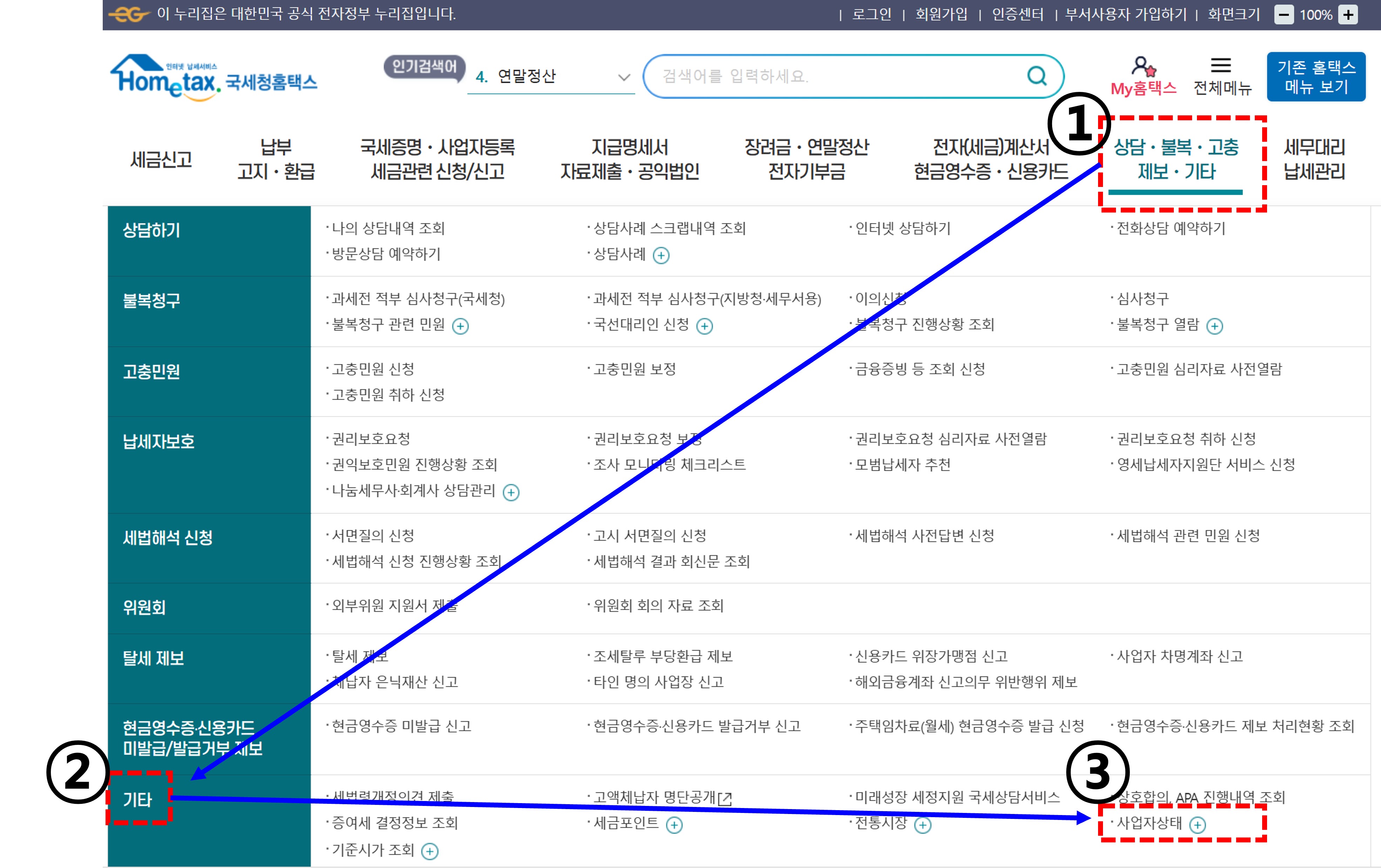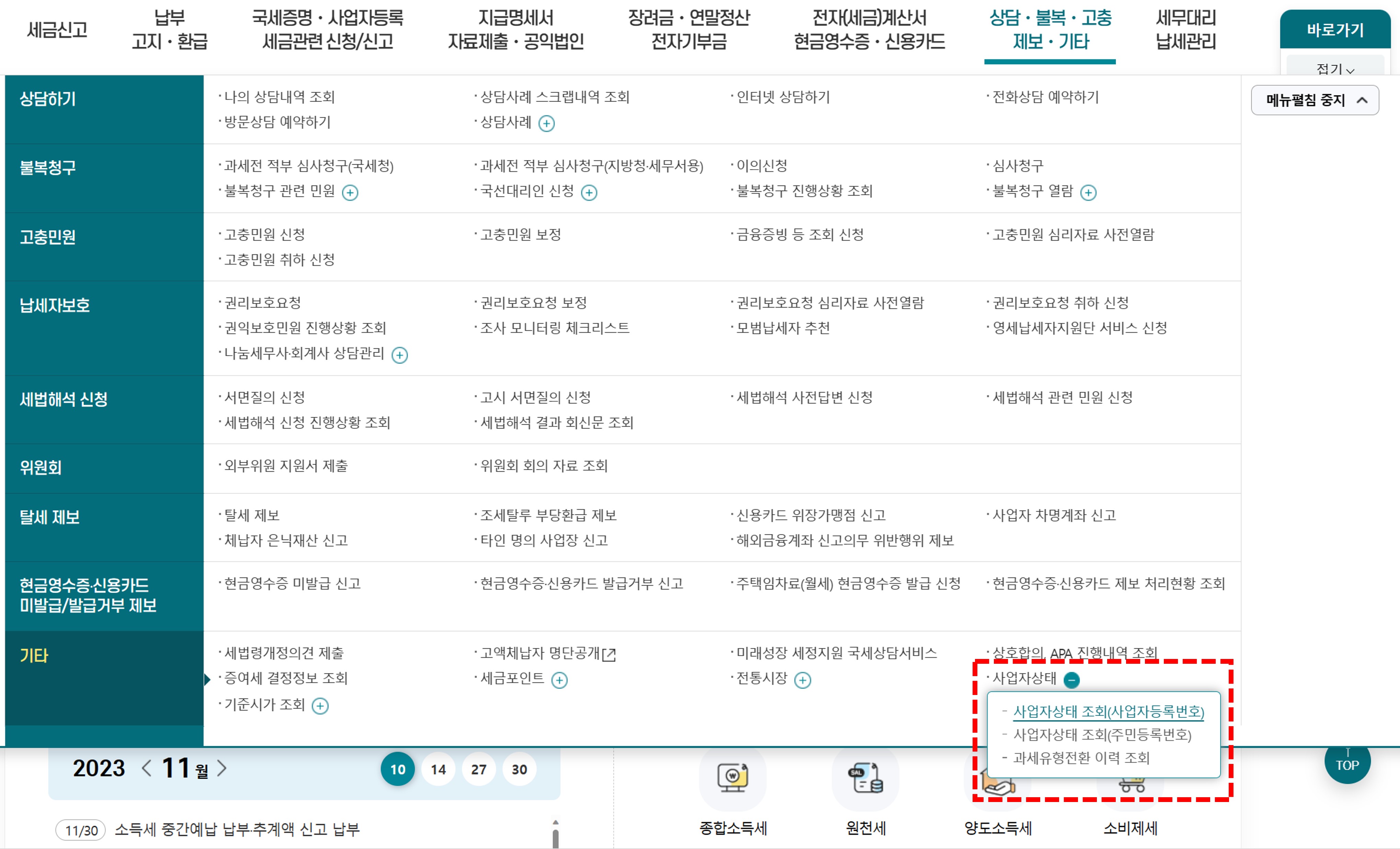 1.국세펑 홈텍스로 이동 후 [상담·불복 · 고충 · 제보 · 기타] 카테고리에 [기타-사업자상태] + 클릭
