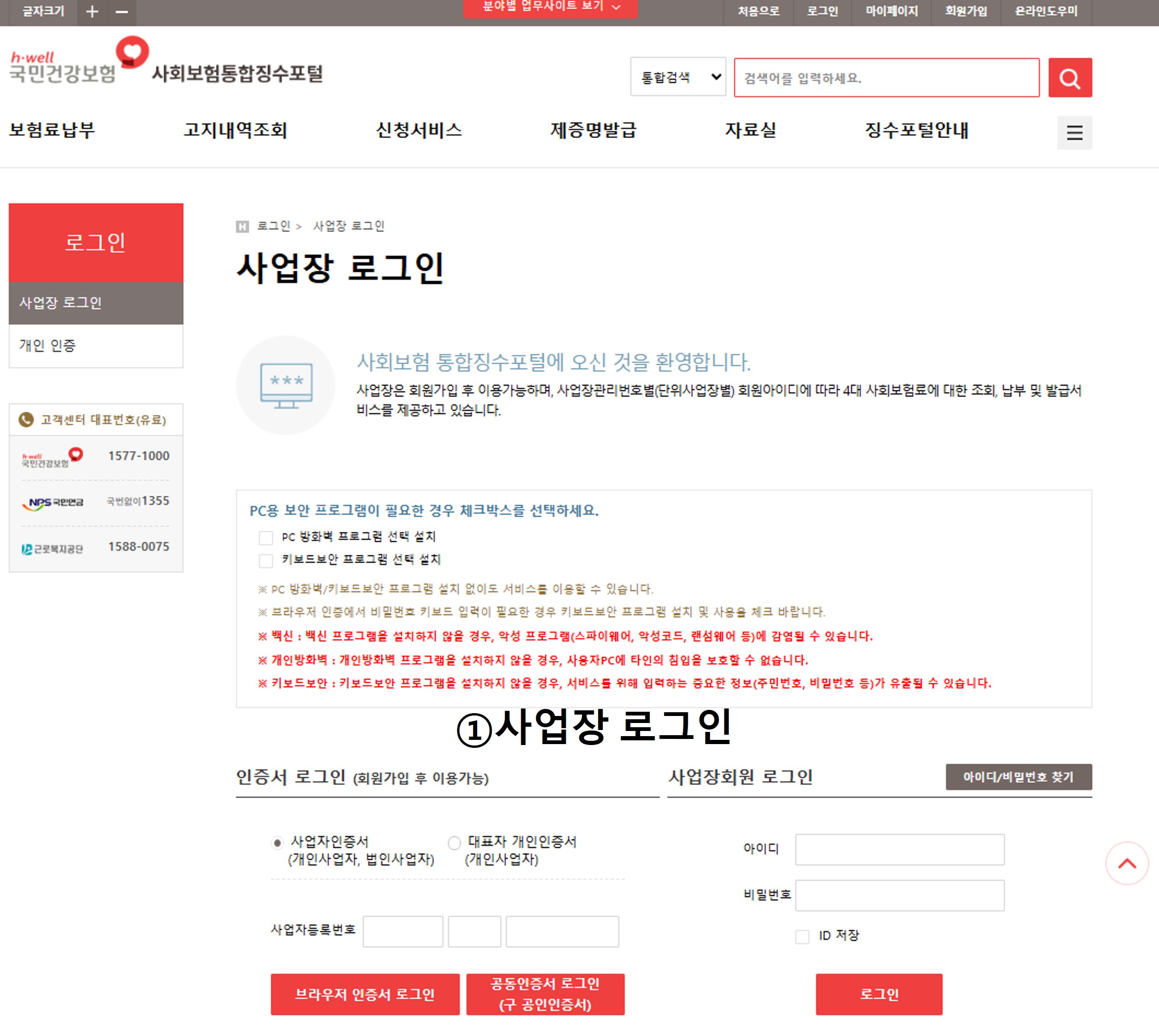 1.사회보험통합징수포털 사이트(https://si4n.nhis.or.kr/) 이동 후 로그인
