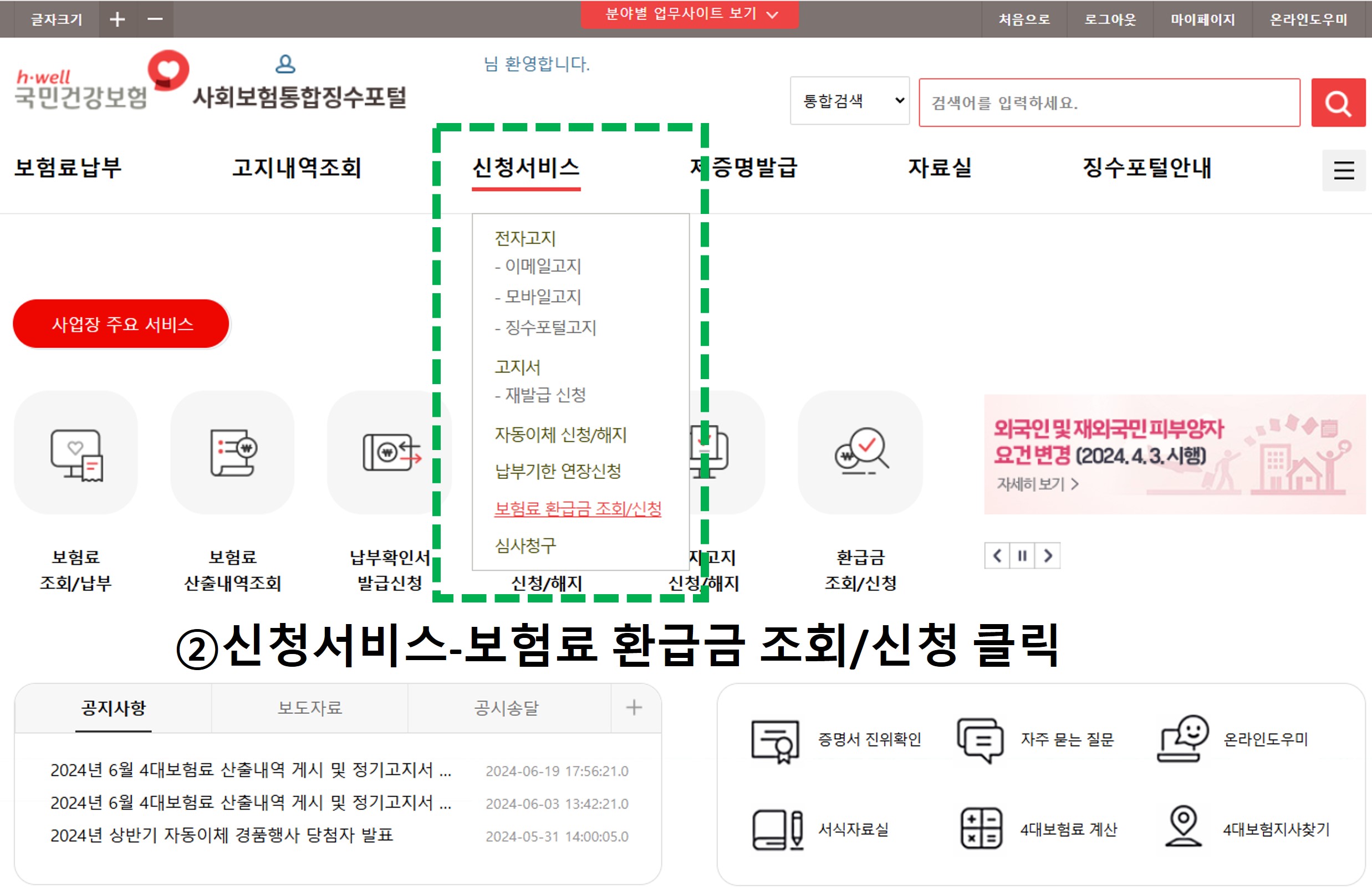 사업장의 경우 4대사회보험 납부하는데 납부방법을 자동이체를 하는 경우가 있습니다. 다만 직원간의 인수인계가 제대로 안되어 새로운 직원이 납부방법이 자동이체인지 모르고 법인카드 납부를 진행하게 되면 과오납금이 발생하게 되면 환금급을 신청하라는 고지서가 오게 됩니다. 고지서를 통해서 신청하는 방법도 있지만 사회보험통합징수포털 사이트를 통해 환급금을 신청하는 방법도 있으니 아래 이미지를 참고해주세요.