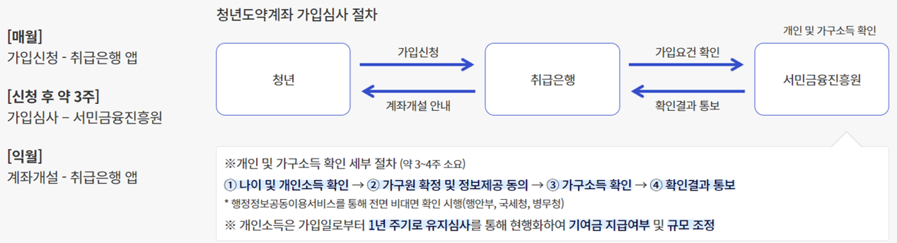 | 가입요건 ① 나이는 신규 가입일 기준 만 19세~34세 이하인 청년이며 병역이행(복무)기간 최대 6년 추가 인정됩니다. 가입요건 ② 개인소득이 직전과세기간의 총급여액이 7,500만원 이하이며, 종합소득과세표준에 합산되는 종합소득금액이 6,300만원 이하인 경우가 해당됩니다. 단, 비과세소득만 있는 경우는 제외됩니다. 가입요건 ③ 금융소득이 가입일이 속한 과세기간의 직전 3개개 과세기간 중 1회 이상 금용소득종합과세대상에 해당하지 않는자입니다. 금융소득종합과세대상은 이자소득 및 배당소득이 2천만원을 초과하는 자입니다. 가입요건 ④ 가구소득은 중위 180%이하인 자입니다. |