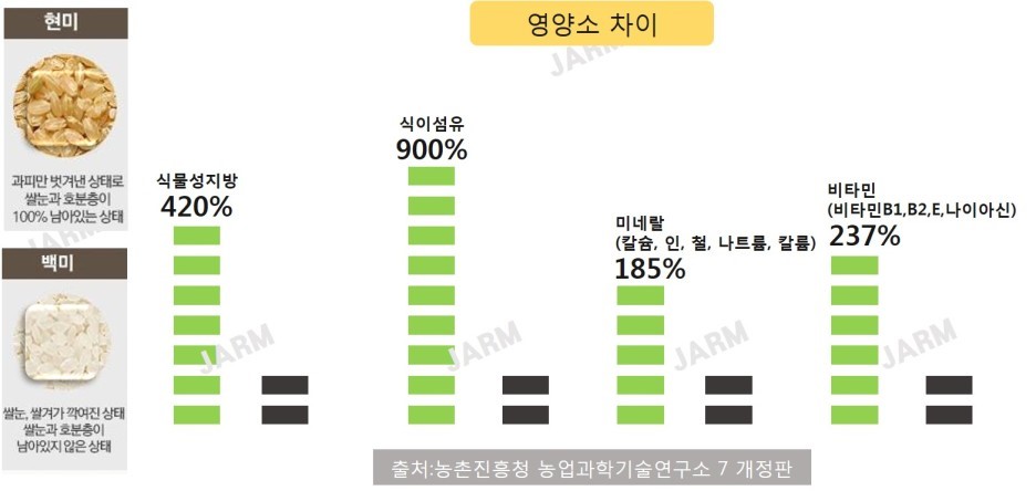 현미는 백미에 들어 있지 않은 식이섬유, 비타민 B군, 칼슘, 마그네슘, 등 성인병 예방에 필수적인 영양소가 함유되어 있으며, 토코페롤보다 항산화작용이 40~60배 강한 것으로 밝혀진 토코트리에놀이 들어 있고, 뇌세포의 활동을 활발하게 하며 뇌졸중, 치매 예방에 도움이 되는 오리자놀 등이 함유되어 있습니다.