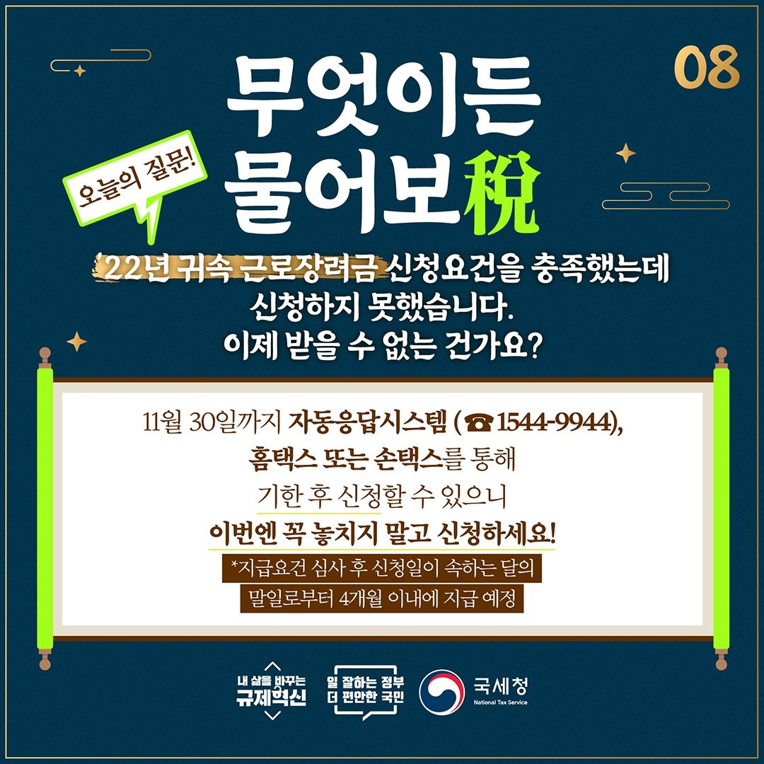 2023년 11월 30일까지 자동응답시스템(Tel.1544-9944) 홈택스 또는 손택스를 통해 기한 후 신청할 수 있으니