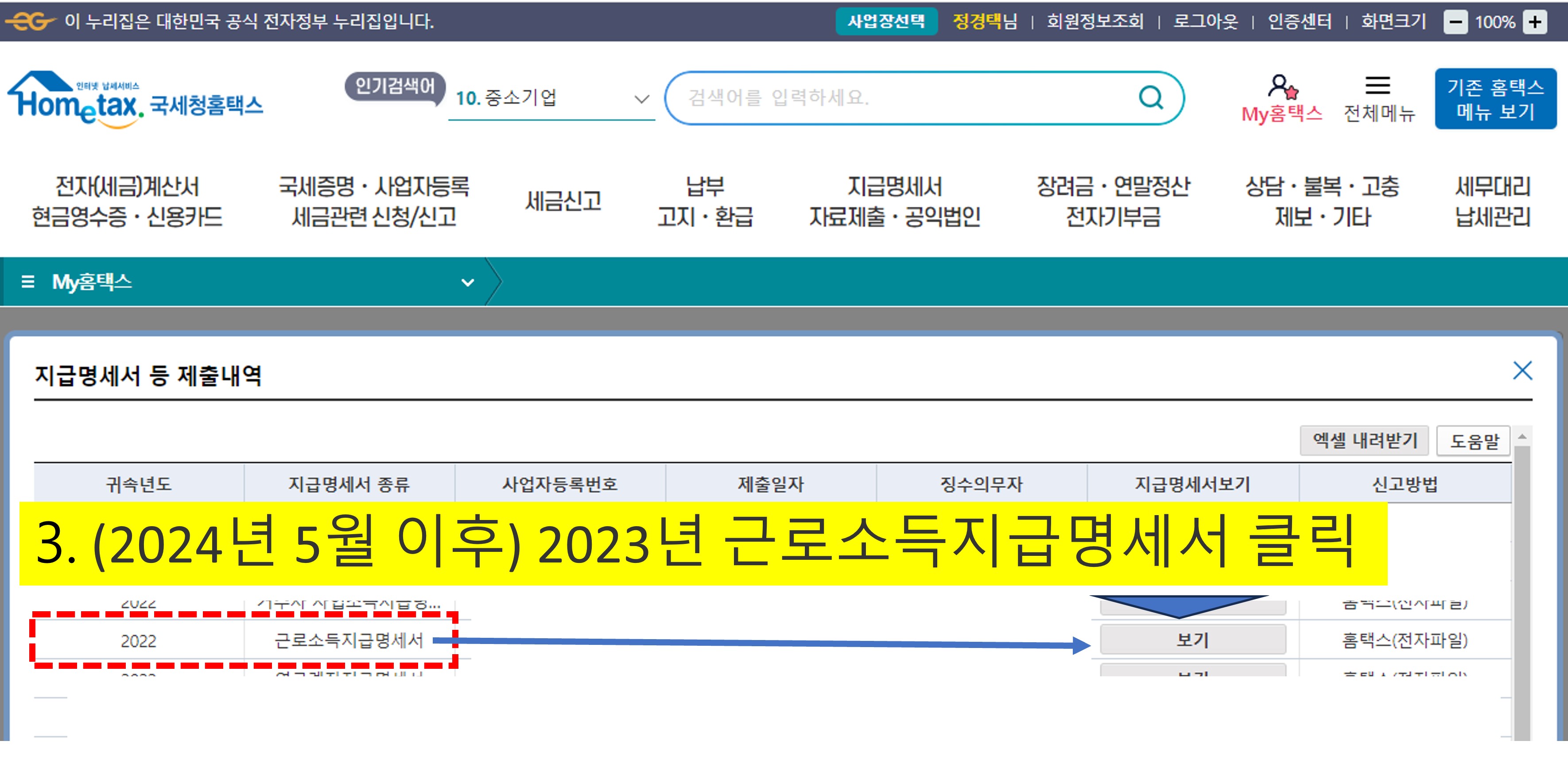 홈택스▶My홈택스 ▶연말정산·지급명세서 ▶지급명세서 등 제출내역 ▶2023년 근로소득지급명세서
